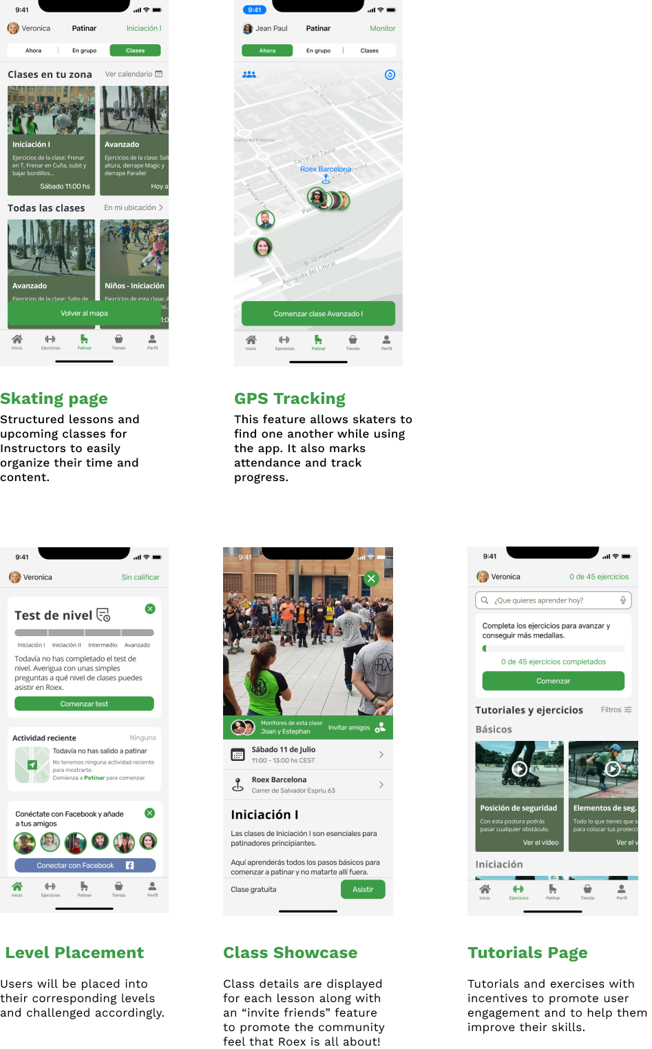 Here is a set of the main features we created for Rollers Roex during this first iteration. Users now have access to a live GPS tracking system, online classes and video tutorials.